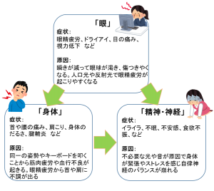 VDT作業を長時間行うことに伴い生じる健康障害の総称 = VDT症候群です。